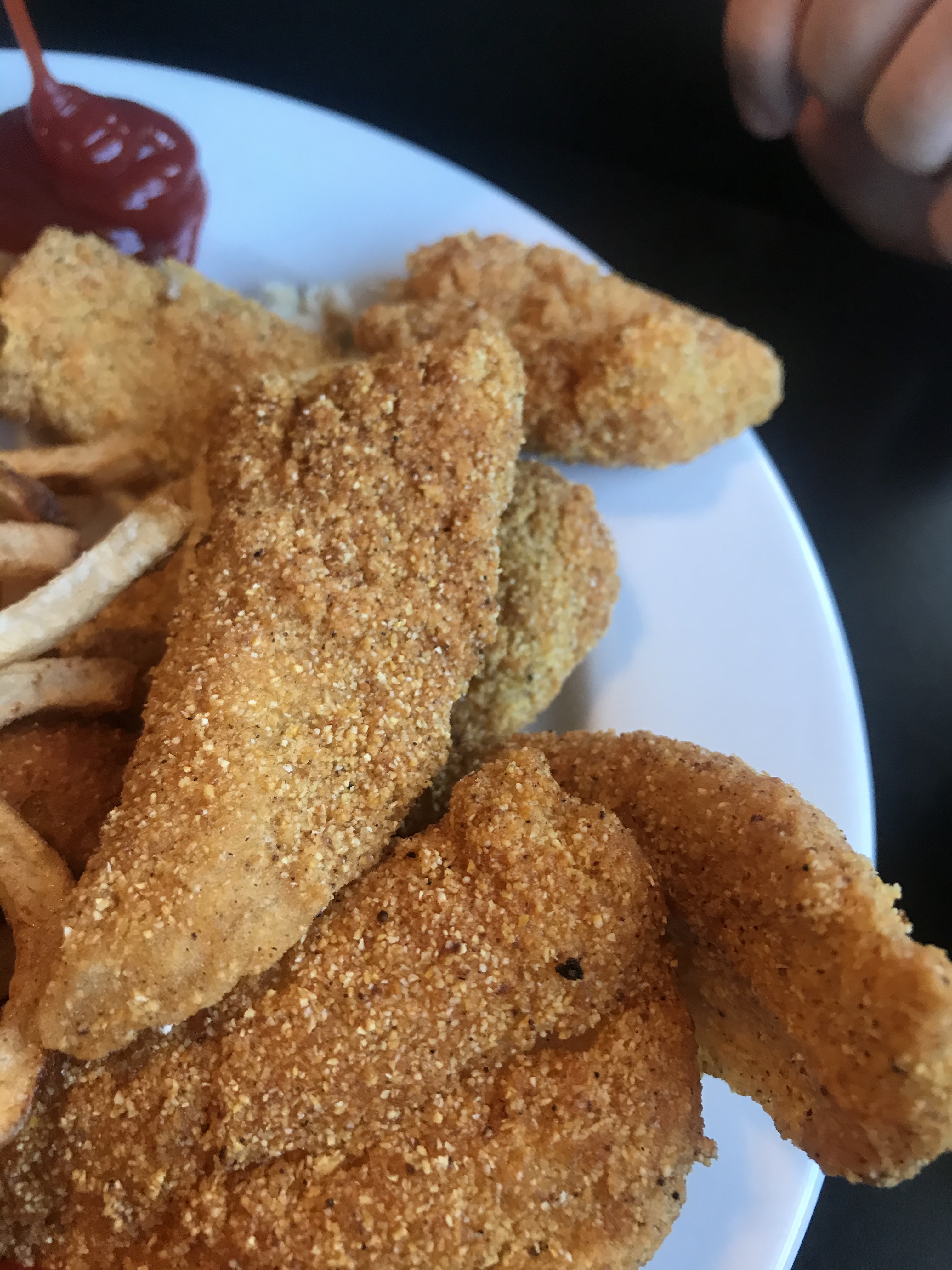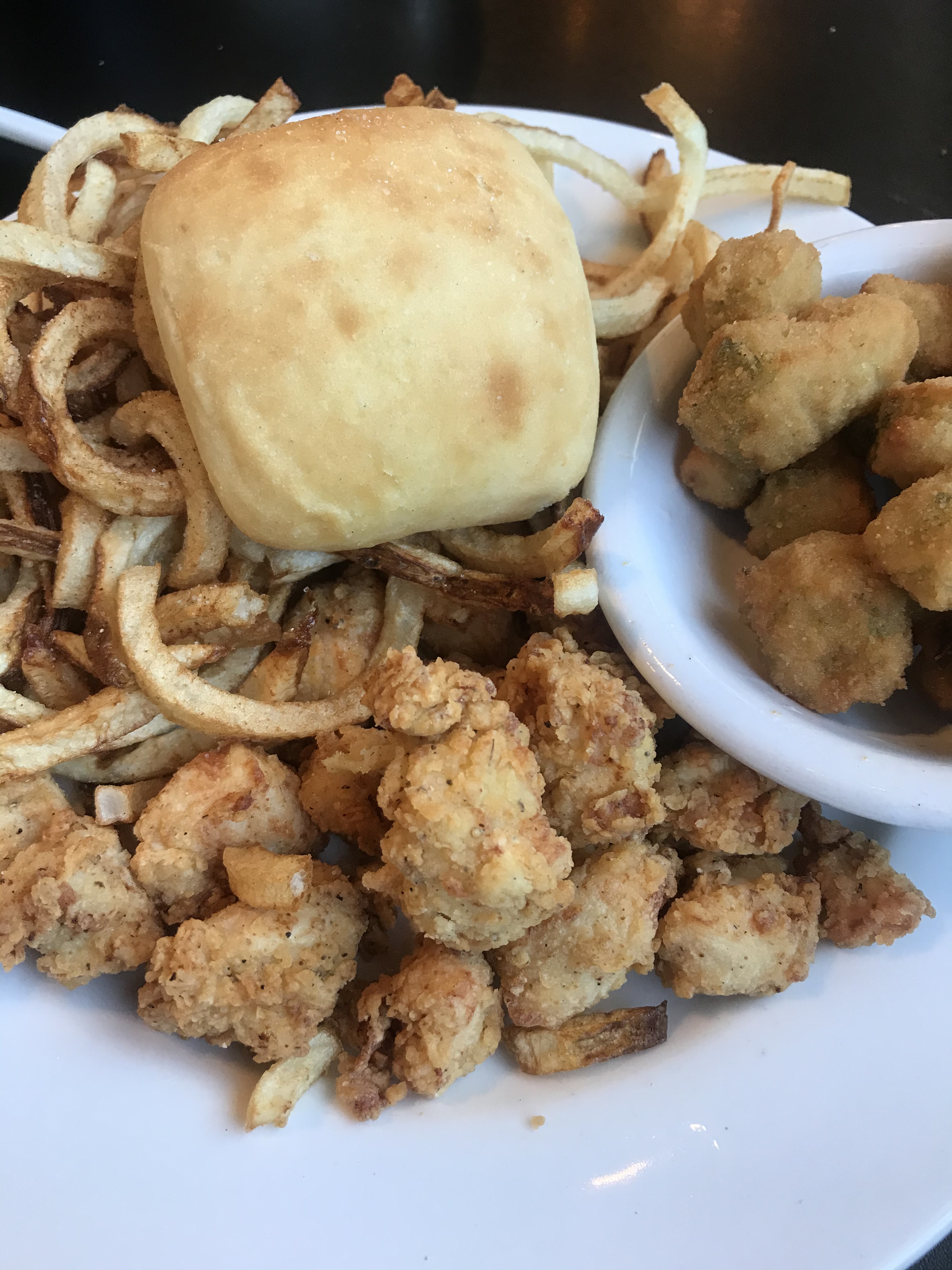 (Chunk Chicken with Fresh Cut Curly Fries and Southern Fried Okra at Destinations)